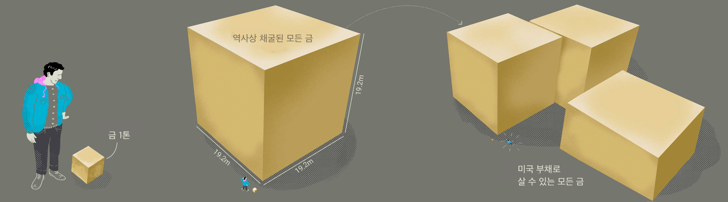 2023년 5월 금값은 온스당 약 1,800달러였다. 1톤의 금을 귀금속 중량 단위로 계산하면 32,150.7 트로이온스이다. 미국 부채한도 31조 4천억 달러로 약 542,595톤의 금을 살 수 있다. 역사상 채굴된 금의 총량은 약 197,576톤으로 추정되는데, 미국의 부채 한도로 이 역사상 채굴된 총량의 약 3배(2.74배)를 살 수 있다.