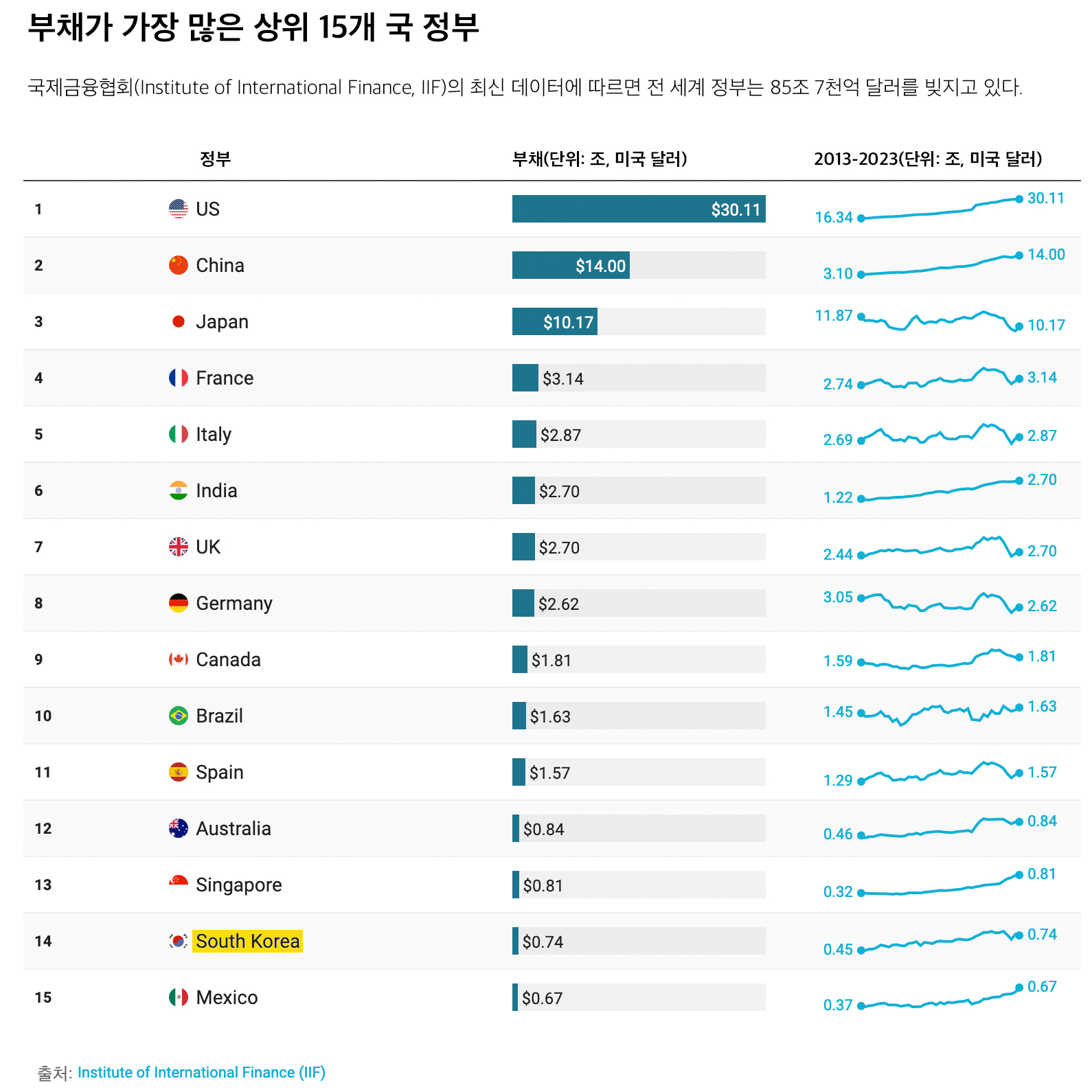 아래 차트는 전 세계 정부 부채 순위로 한국의 부채는 7,400억 달러로 14위에 올라 있다.