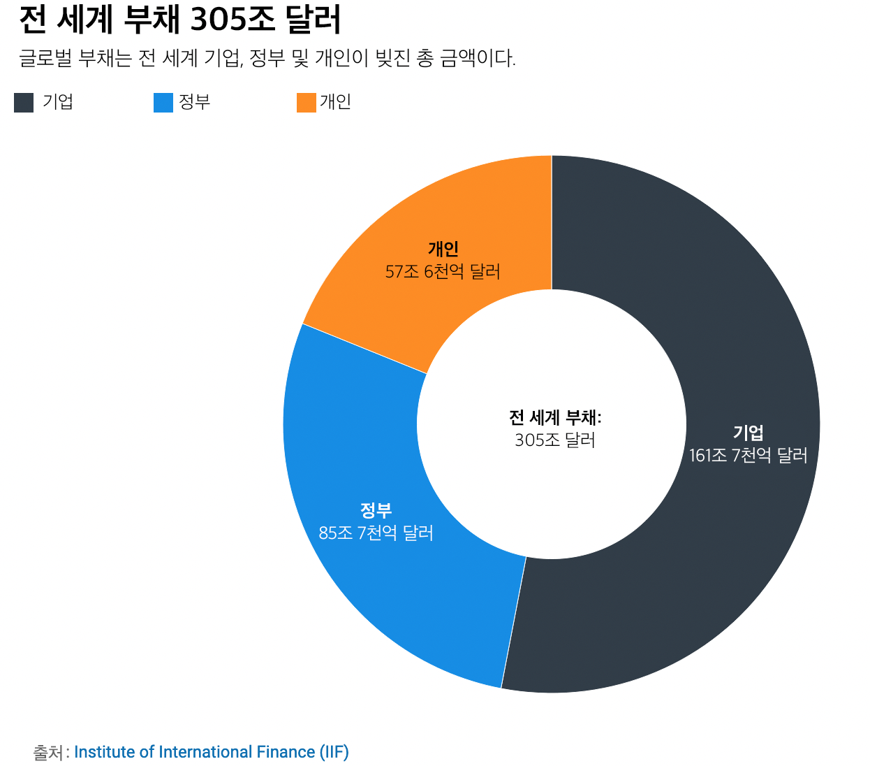 현재 전 세계 부채 규모는 305조 달러이며, 기업 161조 7천억 달러로 가장 높고 그다음으로 정부 85조 7천억 달러 개인 57조 6천억 달러의 순이다.