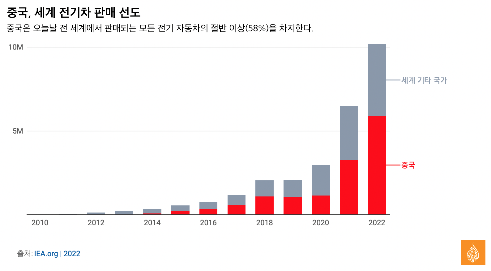 중국은 전 세계적으로 판매되는 모든 전기차의 절반 이상(58%)을 차지한다.