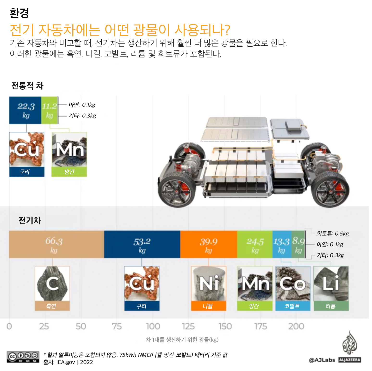 기존 자동차와 비교할 때, 전기차는 생산하기 위해 훨씬 더 많은 광물을 필요로 한다. 이러한 차이점을 설명한다면, IEA는 강철과 알루미늄 외에도 75 kWh NMC(니켈-망간-코발트) 배터리 하나를 장착한 전기차를 생산하는 데 200kg(440파운드) 이상의 광물이 필요하고 한다. 이에 상응하는 전통적인 자동차는 그 생산을 위해 약 34kg의 광물을 필요로 한다.