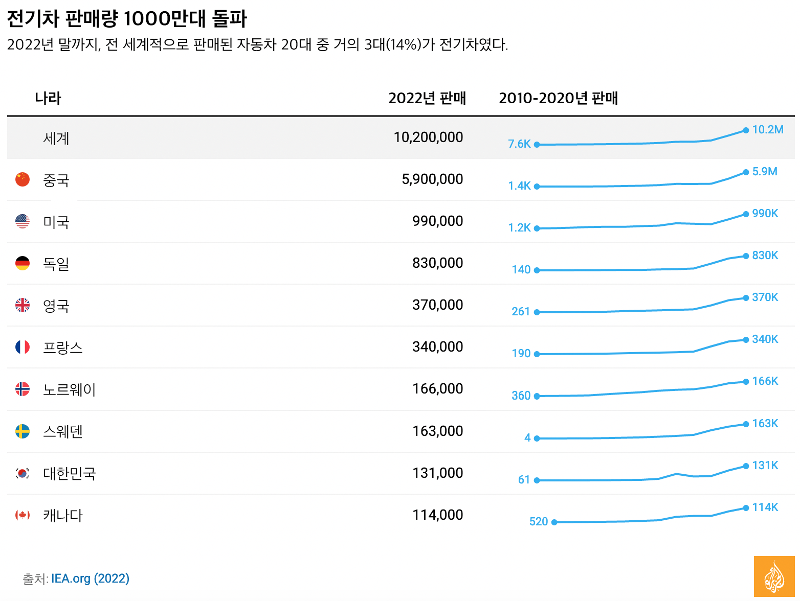 아래 표는 IEA가 데이터를 제공한 국가 중 2010년부터 2022년까지의 전기차 판매 및 동향을 요약한 것이다.