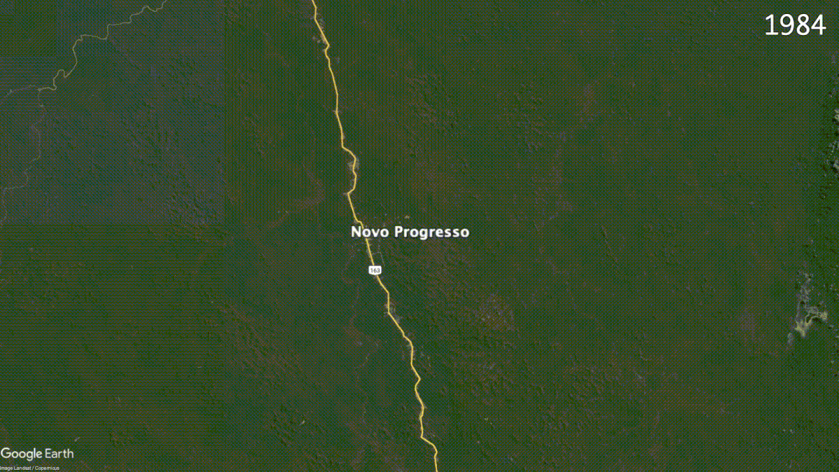 아마존에 미치는 영향은 우주에서도 볼 수 있을 정도로 엄청나다. 2020년, 돔 필립스(Dom Phillips)는 화재 시즌이 시작될 무렵 파라 주의 정착민 마을인 노보 프로그레소(Novo Progresso)에서 보도했다. 1980년과 2023년 사이의 구글 어스 이미지는 이 지역이 어떻게 변화했는지 보여준다.