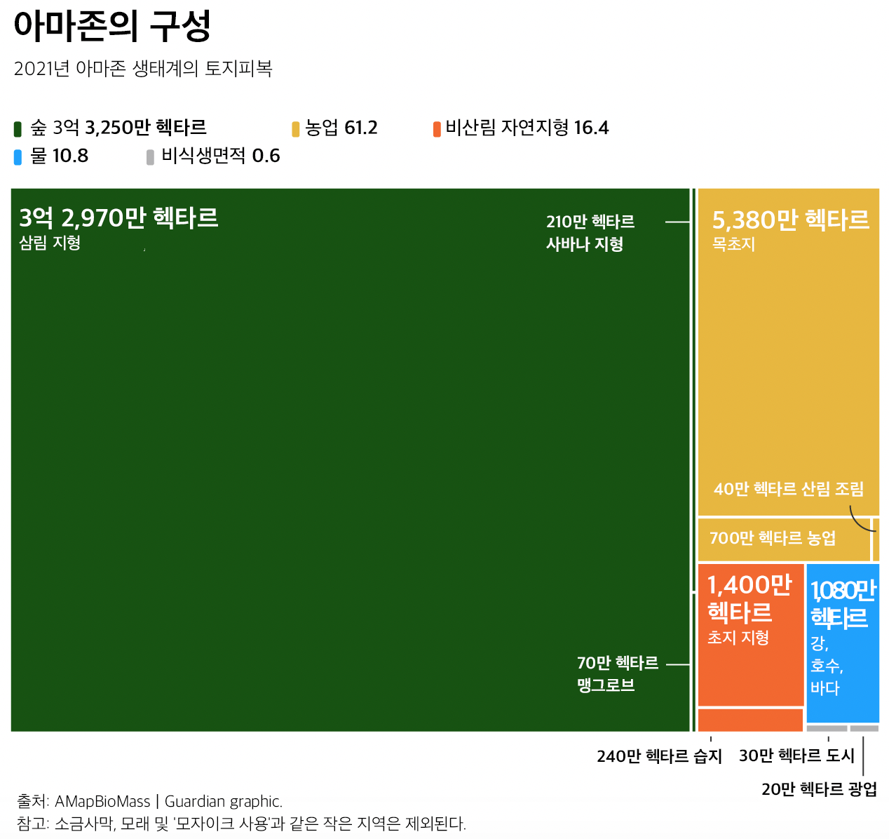 2019년의 지구 삼림 벌채는 약 540만 헥타르였으며 그중 95%가 열대지방에서 발생했다. 이 열대 삼림파괴의 1/3이 브라질에서 발생했으며, 그 규모는 매년 170만 헥타르에 달한다. 그 파괴의 주요 원인은 쇠고기 생산을 위한 목초지 확대, 콩과 야자유를 위한 농경지 확대, 주요 숲의 종이와 펄프를 위한 나무 플랜테이션으로의 전환이었다. 소 목축을 위한 초지 확장은 열대 삼림파괴의 41%를 차지한다. 이는 매년 210만 헥타르에 달하며 네덜란드의 절반 정도 크기다. 이 개간된 땅의 대부분은 브라질에서 왔고, 쇠고기 생산의 확대는 열대 삼림파괴의 4분의 1(24%)을 차지한다. 이는 또한 브라질에서 대부분의 (72%) 삼림파괴는 소 목축에 의해 이루어지고 있다. 해바라기, 홍합, 참깨와 같은 다양한 오일 시드 생산은 18%의 삼림파괴를 주도했다. 소고기와 오일 시드 생산을 위한 삼림 훼손은 전체 삼림파괴의 거의 60%를 차지한다. 삼림파괴의 3번째 주범은 임업 제품의 생산이다. 이 제품들은 종이가 압도적이지만, 목재도 포함한다. 이들 임업 제품까지 포함하면 소, 오일 시드, 임업 제품은 삼림파괴의 거의 4분의 3에 달한다. 세계의 허파라 불리는 아마존 삼림파괴는 정권의 성격에 따라 큰 차이를 보였다. 룰라를 중심으로 한 브라질 노동당이 정권을 잡았을 때는 삼림파괴가 감소했지만, 보우소나루와 같은 우익 포퓰리스트가 정권을 장악했을 때는 삼림파괴가 급증했다. 지금까지 브라질 아마존의 약 17%가 파괴되었고, 만약 그 정도가 20%를 넘어서면 아마존 삼림은 자기 복원능력을 상실하고 돌이킬 수 없을 정도로 급속하게 파괴될 수 있다. 이 글은 Guardian 6월 2일 자 기사 A visual guide to deforestation in Brazil’s Amazon rainforest의 번역으로 브라질 아마존 삼림파괴 정도를 시각적 데이터를 통해 구체적으로 보여주고 있다.