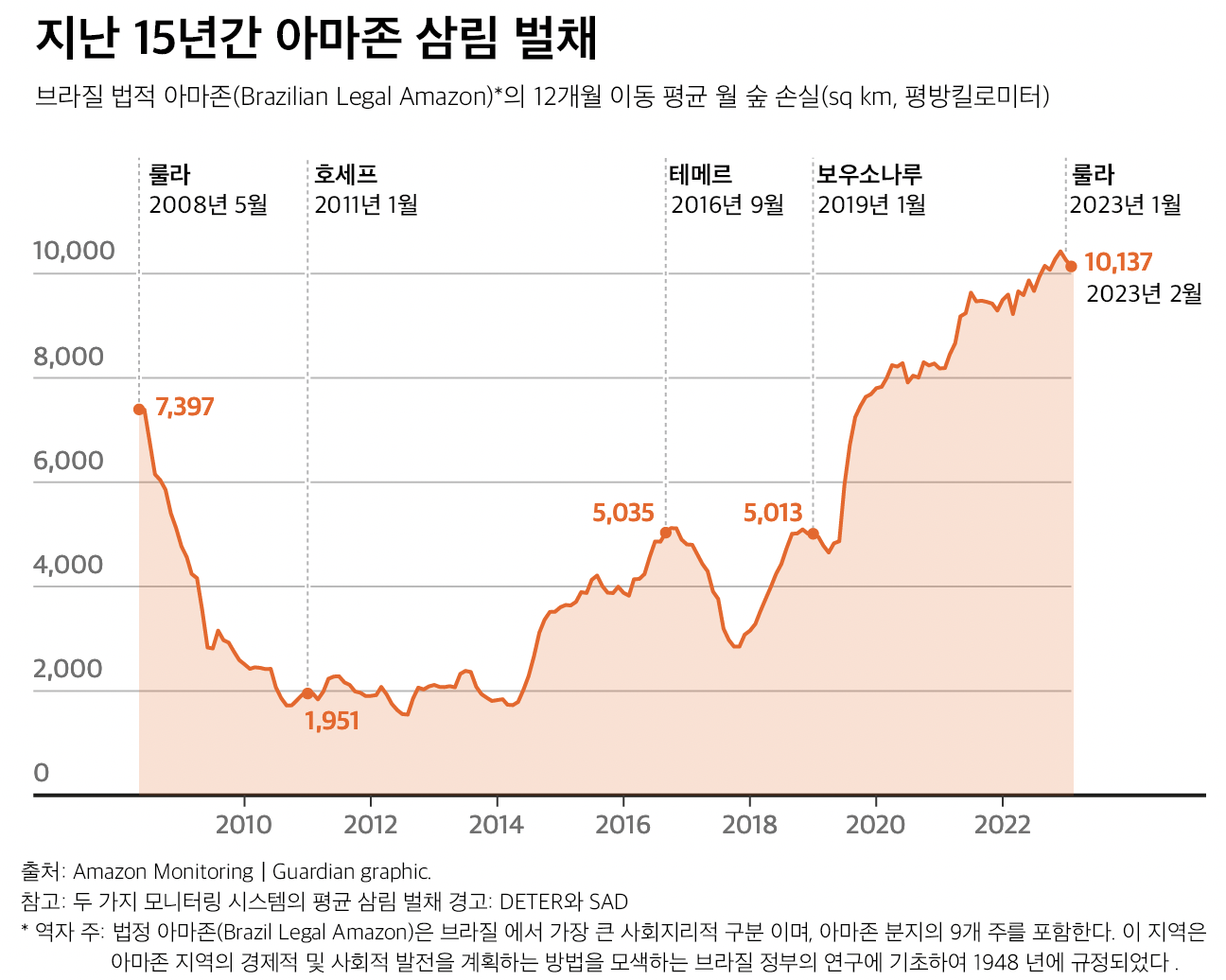 그 숲의 운명은 정치적 리더십과 함께 흥망성쇠 했다. 아마존의 약 17%는 이미 사라졌고, 광대한 가축 목장, 광산, 콩밭으로 대체되었다. 만약 그 수치가 20%에서 25%에 도달한다면, 과학자들은 열대우림이 스스로를 유지하는 능력을 잃게 될 것이고, 재앙적인 결과를 가져올 것이라고 믿는다.