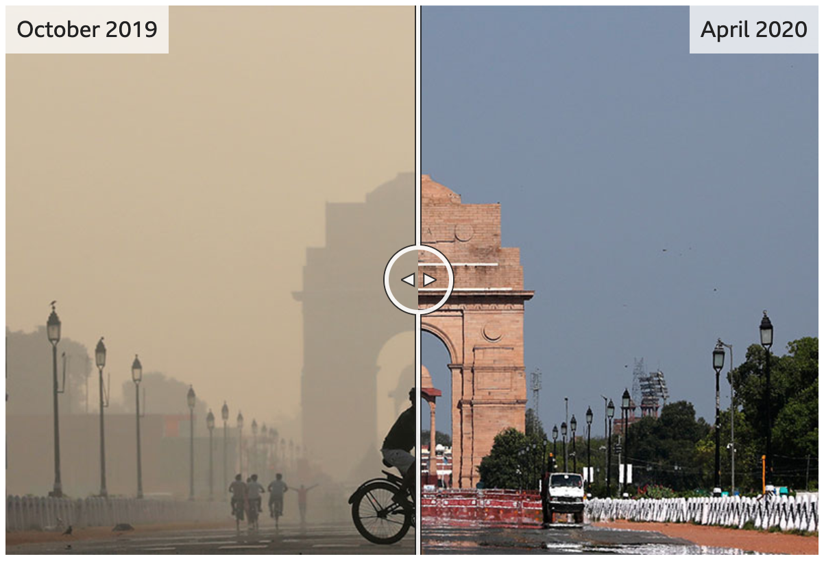 세계보건기구(WHO)가 2020년 3월 11일 뒤늦게 코로나 19 팬데믹을 선언했을 때 지구의 온도는 산업화 이전 시대보다 이미 1.2도가 높아졌다. 코로나 19는 확실히 도시의 공기 질에 '눈에 띄는' 변화를 가져왔다. 인도 델리의 코로나 19 이전 2019년 10월 하늘과 그 이후인 2020년 4월의 하늘 사진은 완연히 다르다.