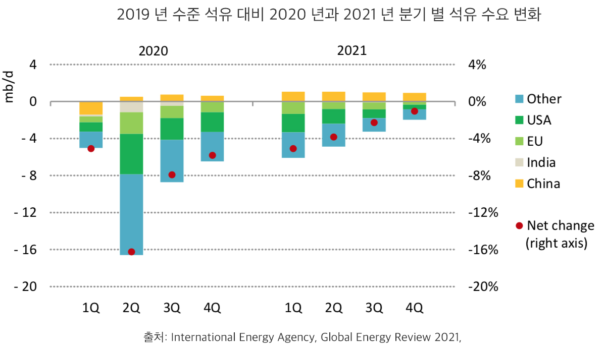 화석 연료별도 그 구성 부분들로 보면 그 감소세는 조금씩 다르다. 석유에 대한 수요는 2019년에 비해 14% 감소했으며, 봉쇄로 인한 도로 통제가 정점에 이르렀던 2020년 4월에 석유 수요는 코로나 19 팬데믹 위기 이전과 비교해 20%까지 감소했었다. 2020년에 석탄 수요는 2억2천만 톤 (Mtce), 즉 4% 감소했다. 제트연료와 등유 수요는 3.2mb/d(41%) 감소했고, 항공 여객 수송량은 2019년 수준보다 66% 낮았으며, 가솔린 수요는 3mb/d(12%) 이상 감소했다. 국제 무역과 함께 벙커 연료 수요가 감소하면서 연료유 수요는 0.5mb/d(8%) 감소했다. 계속되는 화물 운송 활동은 가스 수요 감소를 1.8mb/d (6%) 로 완화 시켰다.