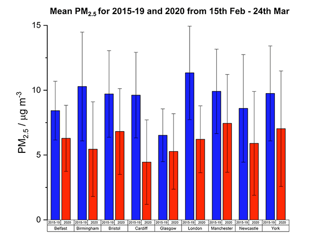 글로벌 에너지 리뷰 2020(Global Energy Review 2020)에 따르면 2020년 4월 전 세계 도로 교통 활동은 약 50%까지 감소했었다. 도로 활동의 감소는 배기가스의 주성분인 이산화질소와 미세먼지의 감소로 이어지고, 이 덕택에 도시의 하늘은 맑아 보였다. 2020년 2월 15일~3월 24일의 런던과 요크, 맨체스터 등 영국의 10개 도시 평균 미세먼지를 2015년~2019년과 비교한 아래 그래프에서 빨간색으로 나타나는 2020년 미세먼지양은 확실히 그 이전보다 절반에서 25% 정도까지 감소했다.