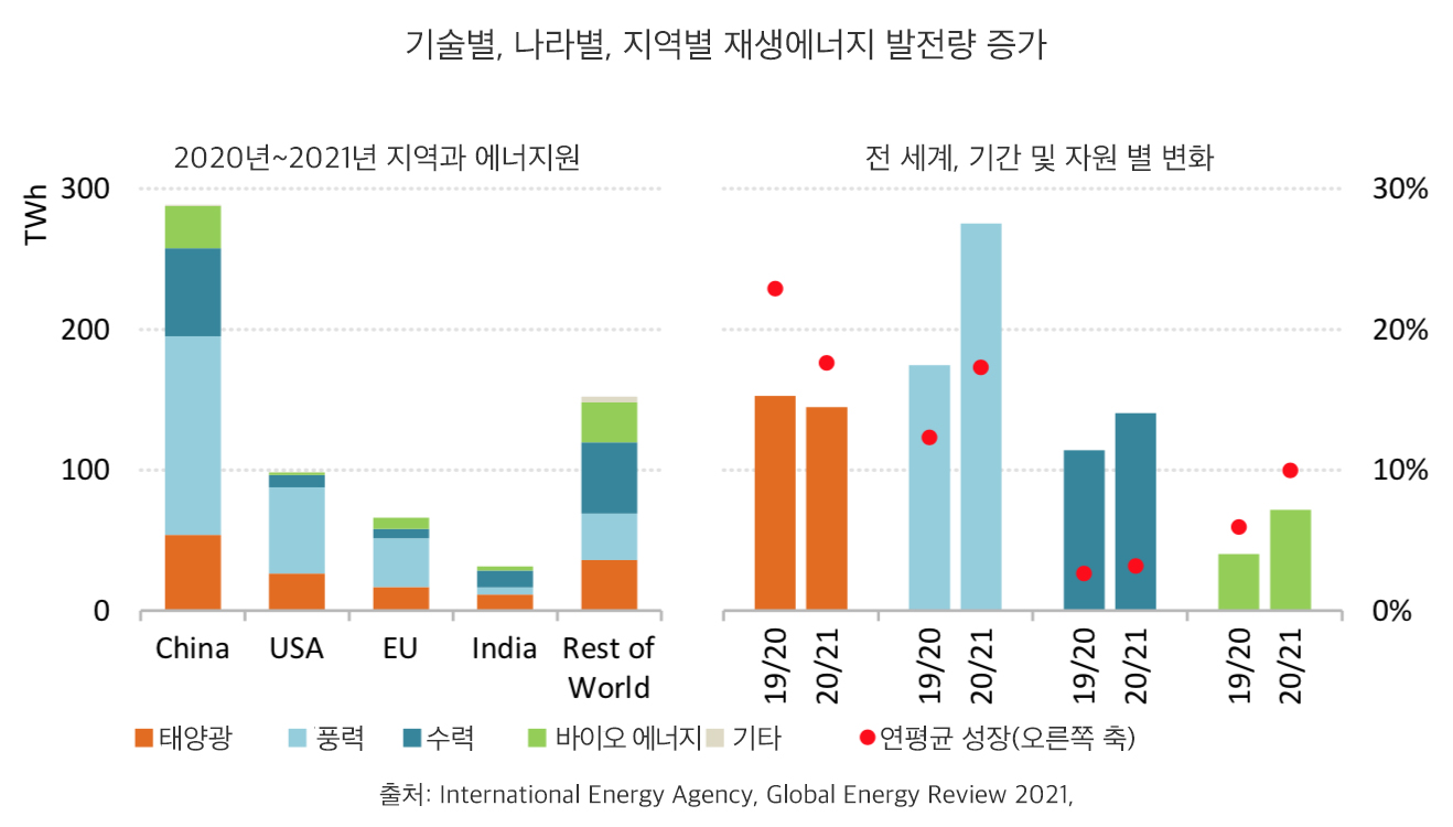 코로나 19는 화석 에너지에 부정적 영향을 미쳤지만, 재생에너지는 반대로 활력을 얻었다. 재생 에너지에 대한 수요는 2020년에 3% 증가했으며 2021년에는 전력, 난방, 산업 및 운송과 같은 모든 주요 부문에서 증가할 것으로 예상된다. 재생 에너지 수요는 8% 이상 확장되어 8,300 TWh에 도달할 것으로 예상된다. 이는 절대적인 측면에서 전년 대비 가장 큰 성장이다. 에너지원으로 보면 태양력과 풍력을 통한 전력 생산이 재생에너지 증가의 주요 부분을 차지한다. 국가별로 보면 특히 중국의 재생에너지 성장은 전 세계 증가분의 거의 절반을 차지한다.